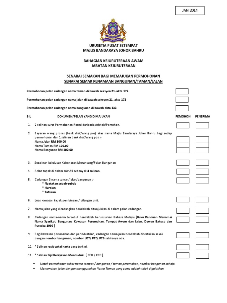 Senarai Semak Penamaan Bangunan Atau Taman Atau Jalan