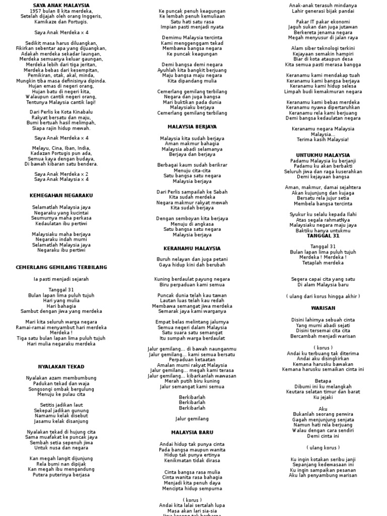Saya anak malaysia lirik lagu patriotik. Sembilan belas lima puluh tujuh bulan lapan kita merdeka setelah dijajah oleh orang inggeris kamikaze dan portugis. Ini kerana rentak dan lirik lagunya yang bersifat evergreen. Melayu iban india cina kadazan portugis pun ada. Banyak lagi lagu yang akan dimasukkan dari masa ke masa.