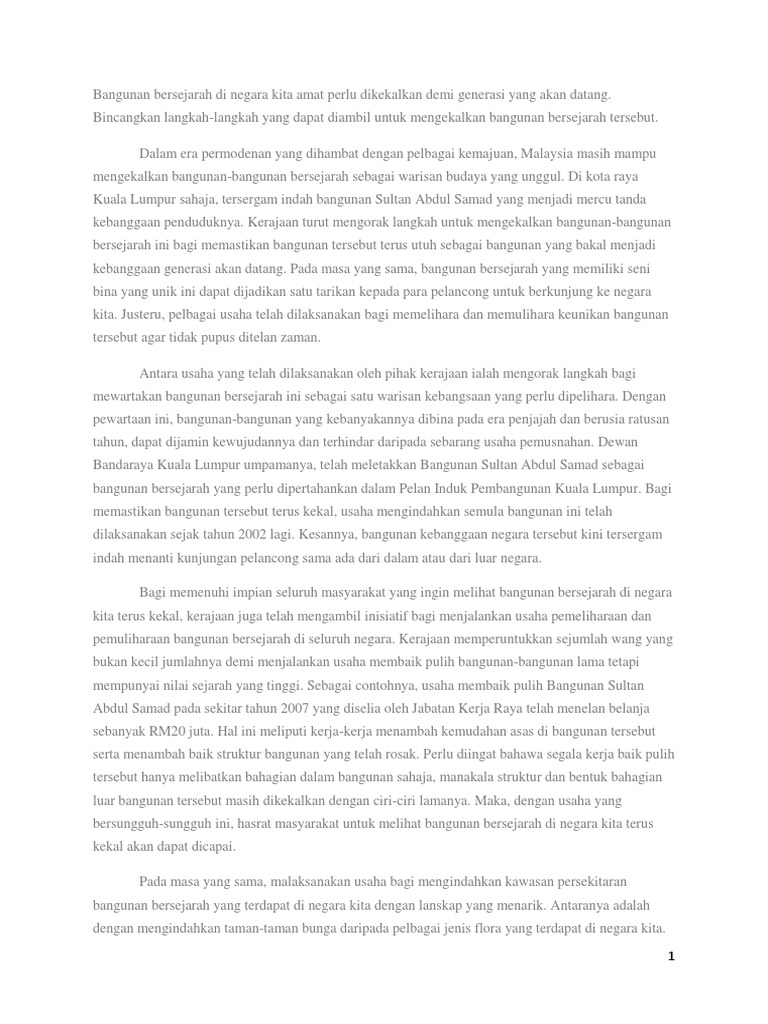 Pelajar perlu menghuraikan isi isi penting dan kritis dalam memberi idea kepada isi karangan tersebut. Di negara kita terdapat banyak bangunan bersejarah yang masih kukuh dan sering menarik perhatian sama ada para pelancong dari dalam atau luar negara. Bangunan bersejarah merupakan sebuah bangunan yang dibina pada zaman dahulu yang menceritakan evolusi manusia dan memberi nilai sejarah yang berlaku di tanah air kita. Senarai langkah memelihara bangunan bersejarah.