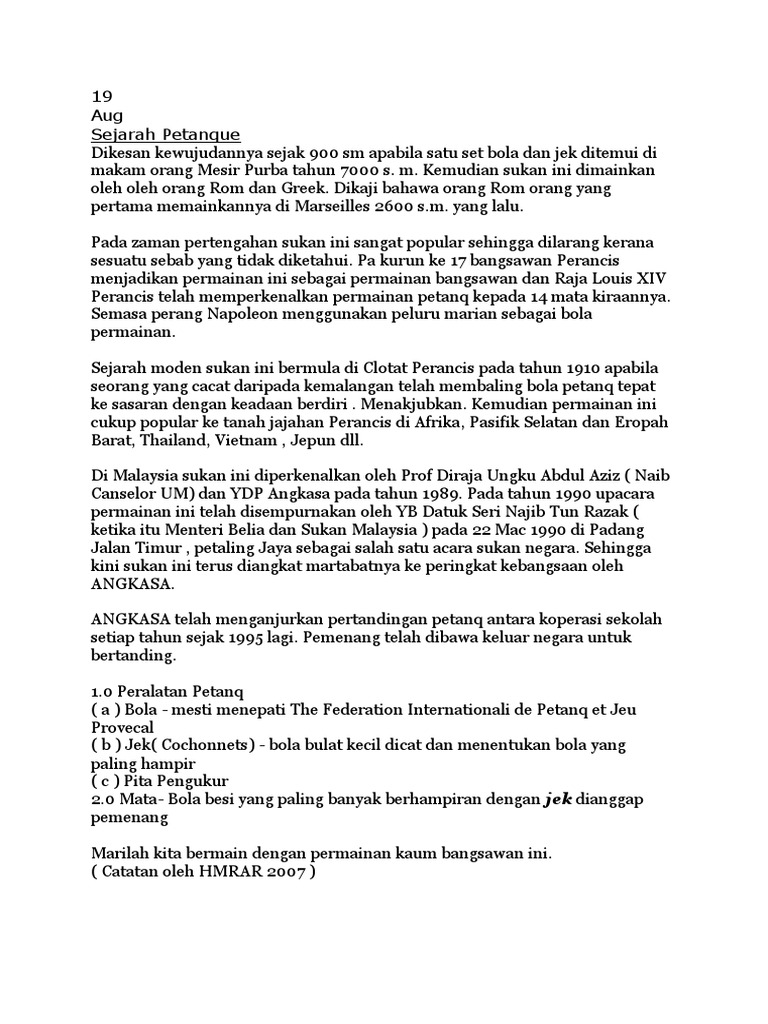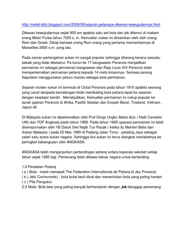 Sejarah petanque dikesan kewujudannya sejak 900 sm apabila satu set bola dan jek ditemui di makam orang mesir purba tahun 7000 s. Diraja ungku abdul aziz yang dipertua angkasa pada pertengahan tahun 1989. Academia edu is a platform for academics to share research papers. Pada saat itu indonesia mengirimkan 1 tim atlet petamque yang terdiri dari 8 orang.