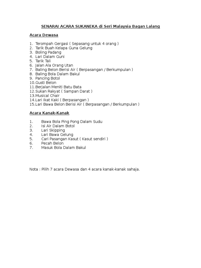 Takde satu pun yg akan i buat untuk acara esok ni. Ada juga saya selitkan permainan tambahan yang saya pernah lihat sebelum ini yang dijalankan di sekolah atau pun di tempat lain. Berikut adalah senarai permainan sukaneka yang dimainkan oleh anak anak berumur antara 4 6 tahun di tadika tersebut. Acara ini sesuai untuk kanak kanak berumur 3 6 tahun.