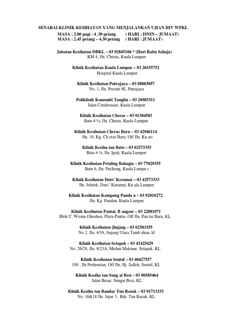 Senarai klinik kesihatan kerajaan ujian hiv no. 1 perkhidmatan pesakit luar a perkhidmatan penyakit kronik. 1 jalan presint 9e putrajaya 03 8888 3057 poliklinik komuniti tanglin jalan cenderasari kl 03 2698 3311 klinik kesihatan cheras baru jln 16 kg cheras baru off jln kuari kl 03 4294 6114. Tingkat bawah no 12b bangunan lppkn jalan raja laut 50350 kuala lumpur.