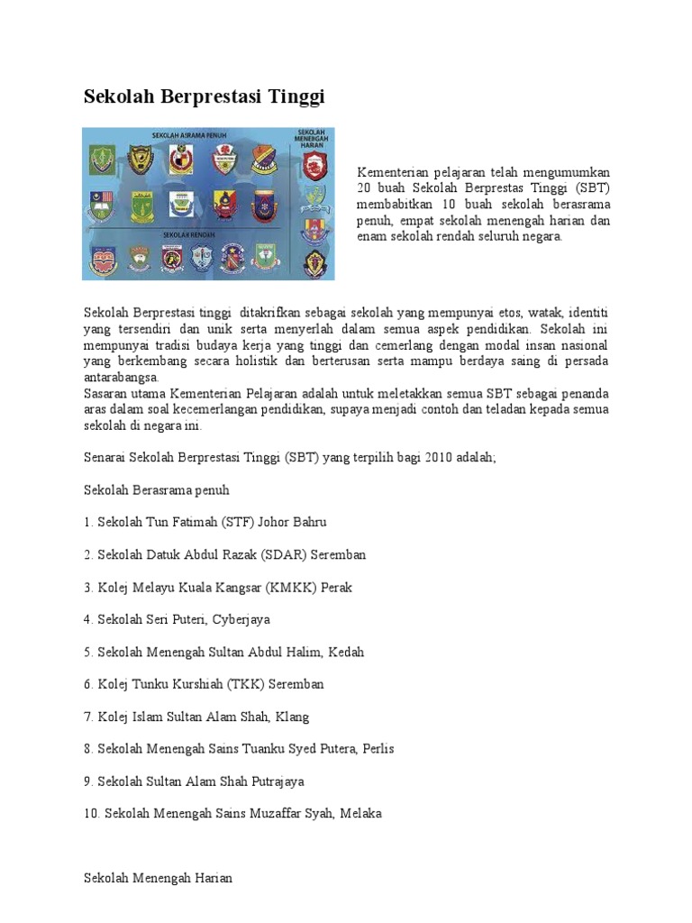 Senarai Sbt Sekolah Berprestasi Tinggi Di Malaysia