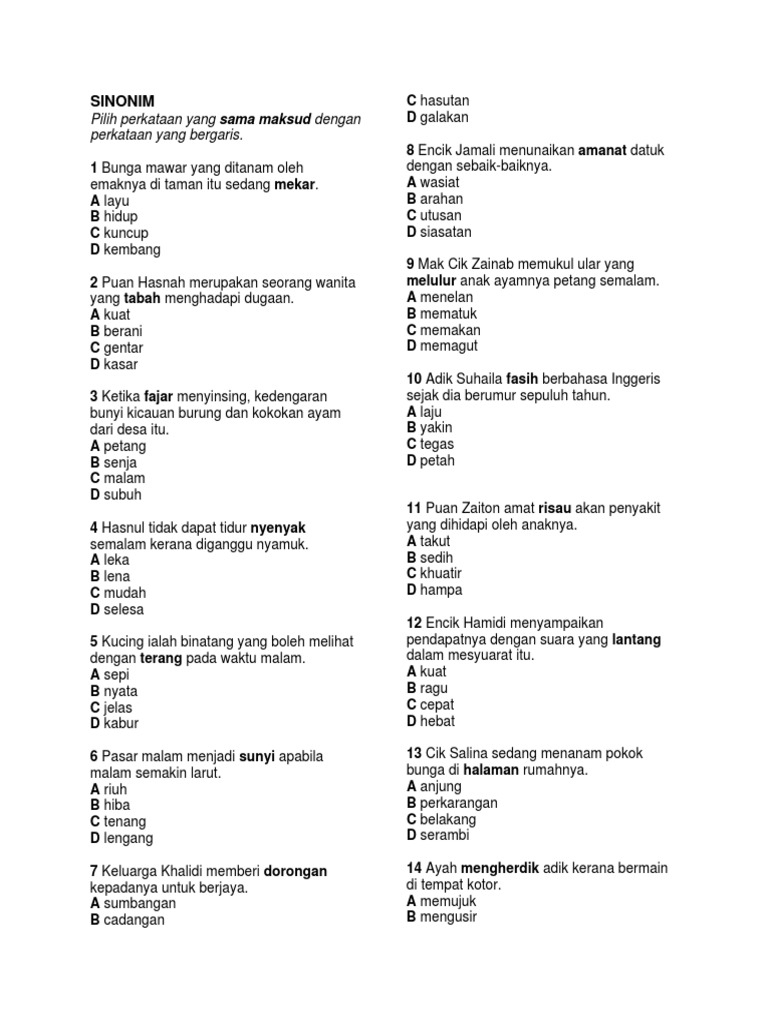 Sinonim Pdf Latih Tubi Tatabahasa Sinonim Sinonim Pilih Perkataan Yang Sama Maksud Dengan Perkataan Yang Bergaris 1 2 3 4 5 Bunga Mawar Yang Ditanam Course Hero