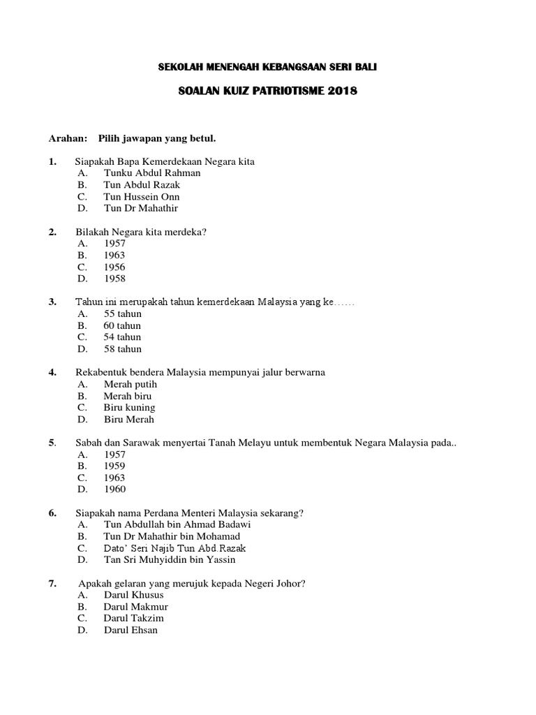 Soalan Soalan Kuiz Kemerdekaan 2013 Bahagian I Soalan Soalan Subjektif