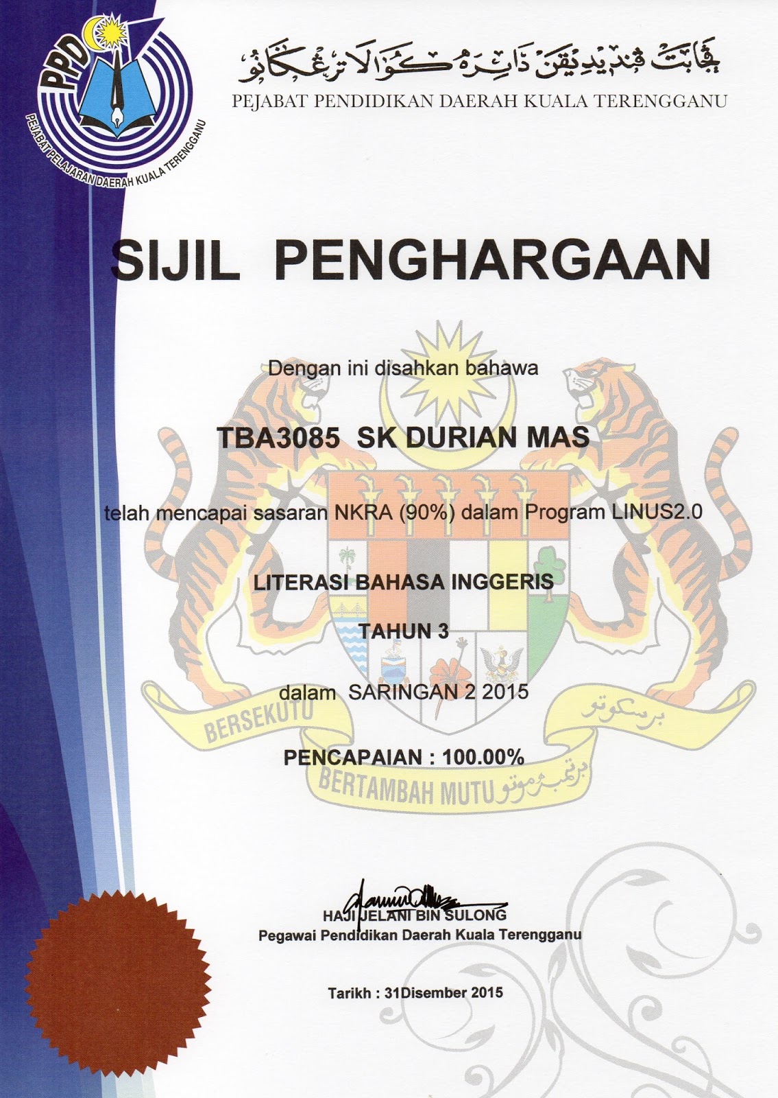 Linus 2 0 Sekolah Kebangsaan Durian Mas Manir Kuala Terengganu Sijil Penghargaan Saringan 2 Linus 2 0 Tahun 2015