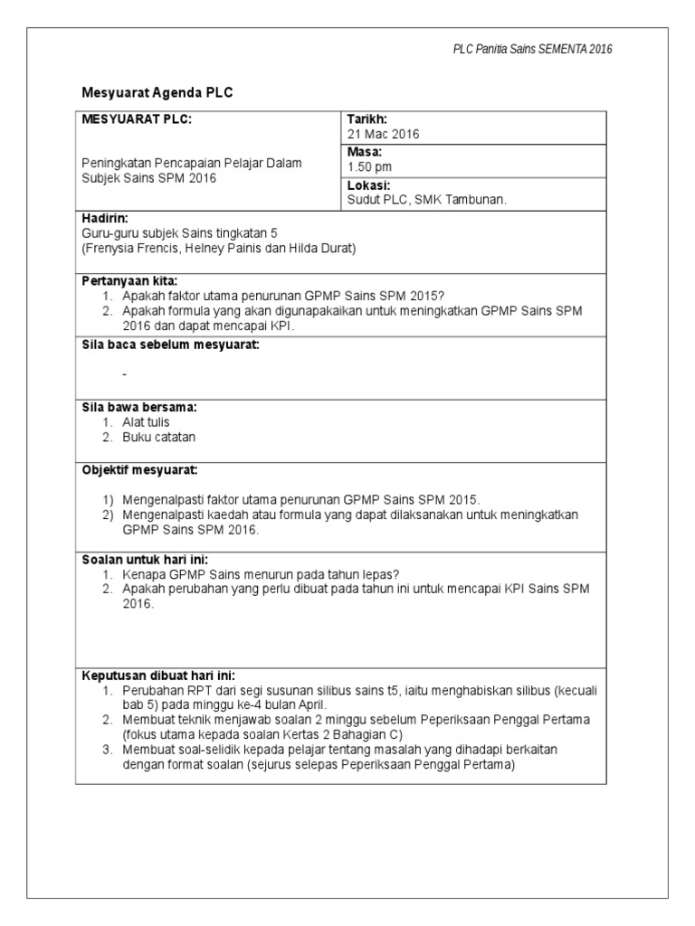 Mesyuarat Agenda Plc Sains Spm 1
