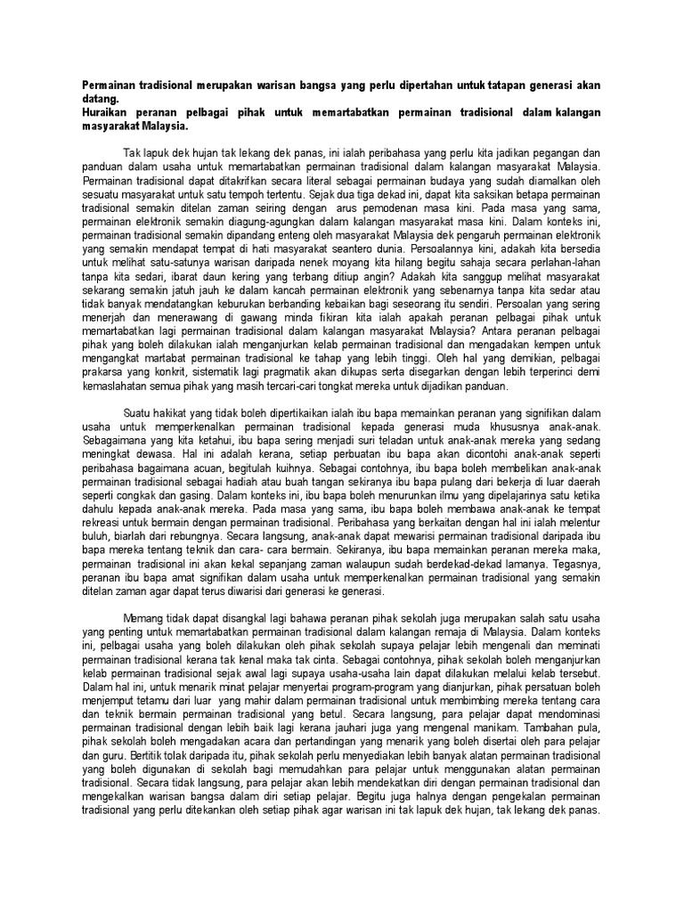 Sukan tradisional mengikut kaum. Dalam permainan tradisional ini alatan yang digunakan adalah papan congkak dan buah congkak. Perbezaan tujuan inilah yang membezakan sifat sesuatu sukan itu. Kementerian pelajaran malaysia kpm telah berusaha untuk mengatasi masalah kepelbagaian sosio budaya melalui aktiviti yang disenaraikan di sekolah tersebut. Sukan rakyat dan tradisional rakyat malaysia pengenalan.