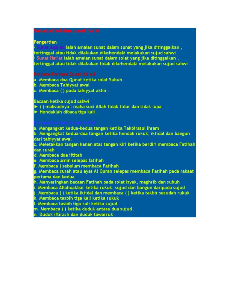 1 tahiyyat awal 2 bacaan selawat semasa tahiyyat awal 3 duduk tahiyyat 4 doa qunut 5 bacaan selawat semasa membaca doa qunut. Namun adakah anda tahu dan faham mengenai. Jika kita meninggalkan sunat ab ad maka disunatkan untuk kita tampalkan dengan sujud sahwi. Oleh itu artikel ini akan membantu anda memahami dua jenis perkara sunat dalam solat ini.