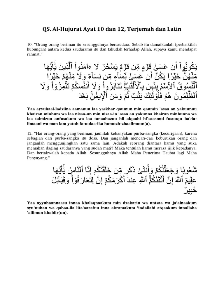 Anda juga dapat membaca surat al hujurat satu surat lengkap dengan arab dan juga terjemahnya jika anda ingin membaca surat ini secara keseluruhan anda. Ya memang agak terbalik susunannya ayat 12 dulu baru ayat 10. Adakah seorang diantara kamu yang suka memakan daging saudaranya yang sudah mati. Sesungguhnya allah maha penerima taubat lagi maha penyayang.