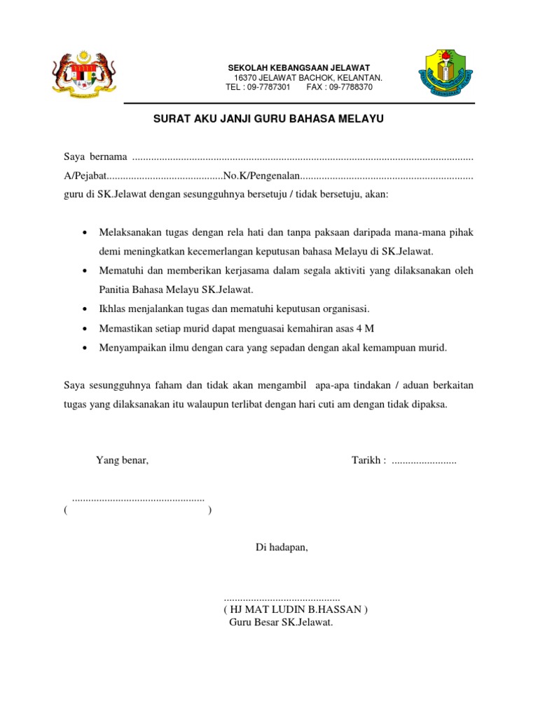 Surat Aku Janji Guru Bahasa Melayu 16370 Jelawat Bachok Kelantan Tel 09 7787301 Fax 09 7788370