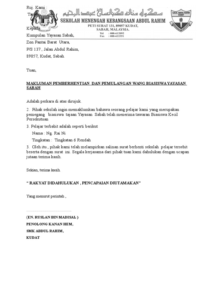 Surat Berhenti Sekolah Tingkatan 6