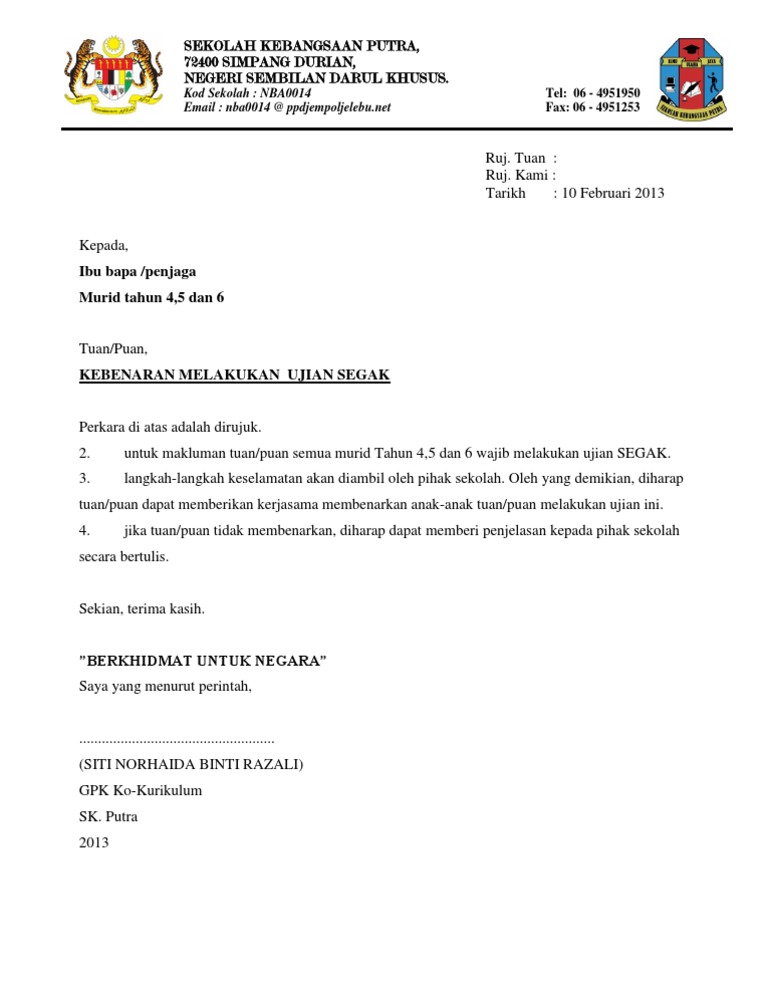 Surat Kebenaran Ibu Bapa Untuk Ujian Segak