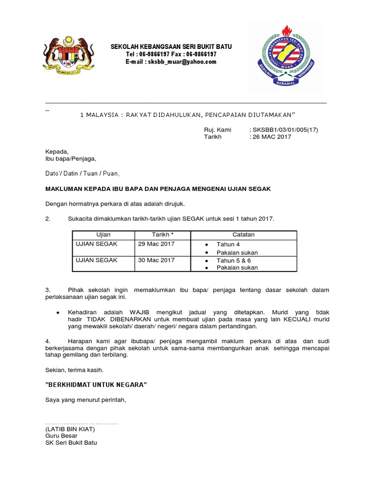 Surat Makluman Ujian Segak 2019
