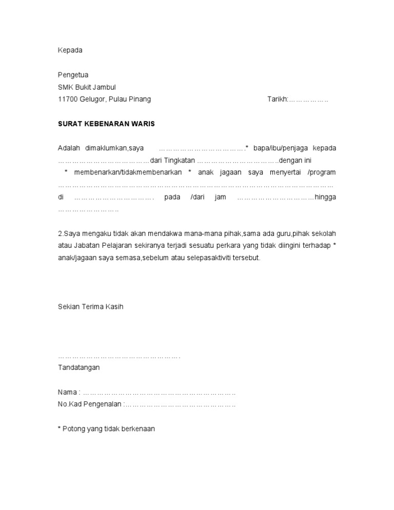 Contoh Surat Kebenaran Ibu Bapa