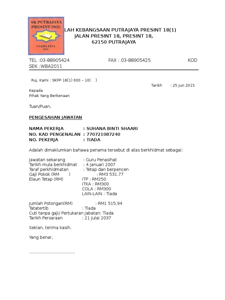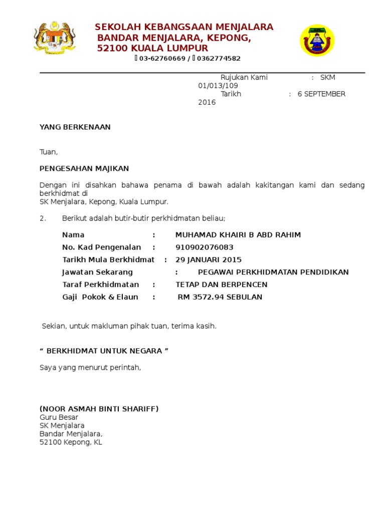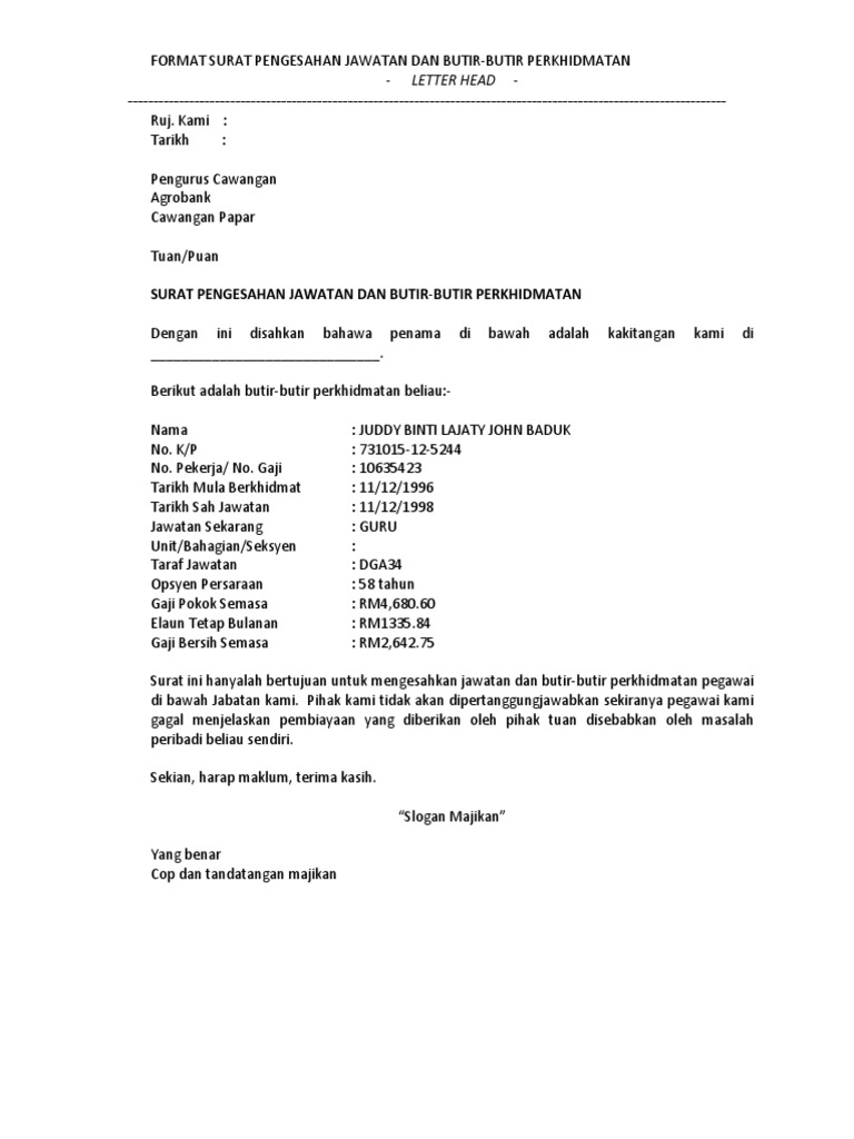 Jangan dedahkan guru dengan risiko luar bidang iguru. Ingin memohon pinjaman atau memohon perkerjaan yang mana memerlukan anda mendapatkan salinan surat pengesahan dari majikan untuk mengesahkan butir maklumat anda sepanjang berkhidmat. Contoh surat pengesahan majikan. Ingin memohon pinjaman atau memohon perkerjaan yang mana contoh surat berhenti belajar.