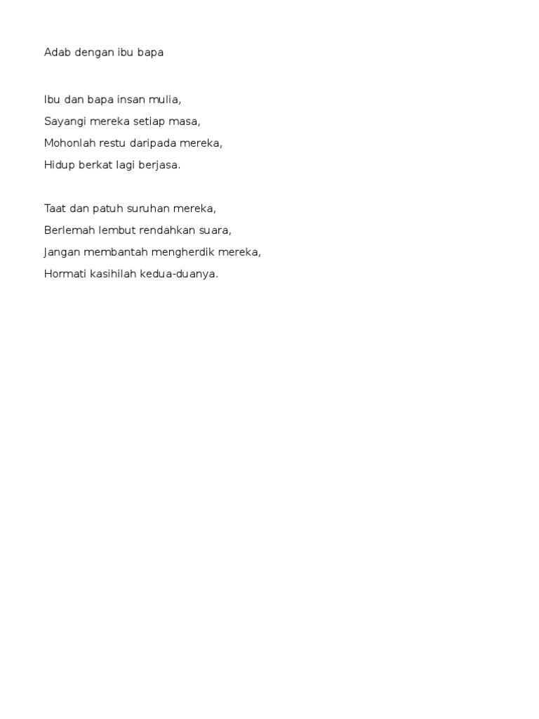 Syair adab dengan ibu bapa ibu dan bapa insan mulia sayangi mereka setiap masa mohonlah restu daripada mereka hidup berkat lagi berjasa. Dengan itu proses ini perlulah dilakukan dengan penuh adab dan ketertibannya bagi menjamin keberkatan dan keberkesanan tujuan tersebut. Taat dan patuh suruhan mereka berlemah lembut rendahkan suara jangan membantah mengherdik mereka hormati kasihilah kedua duanya syair adab dengan ibu bapa ibu dan bapa insan mulia sayangi mereka setiap masa mohonlah restu daripada mereka hidup berkat lagi berjasa. Celik sastera 3 264 views.