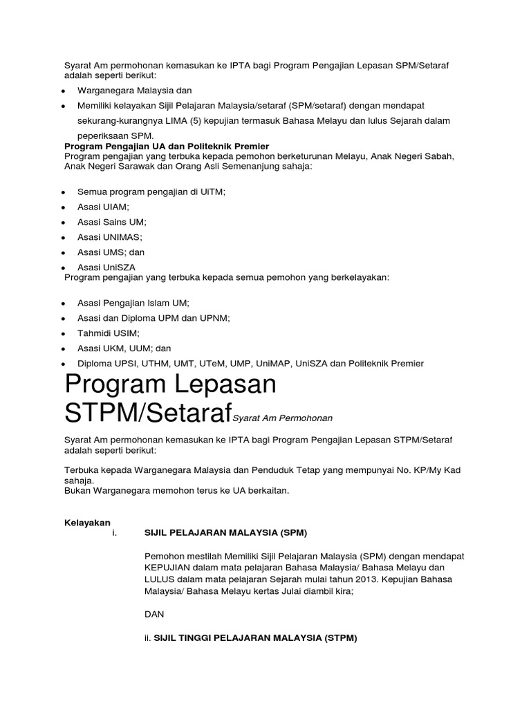 Syarat syarat kemasukan uitm bagi lepasan spm stpm matrikulasi dan diploma. Mendapat kepujian dalam bahasa melayu di peringkat spm setaraf. Berikut pula adalah syarat syarat am kemasukan ke uitm yang wajib dipenuhi bagi calon calon lepasan spm stpm matrikulasi dan juga diploma. Kelayakan minimum spm.