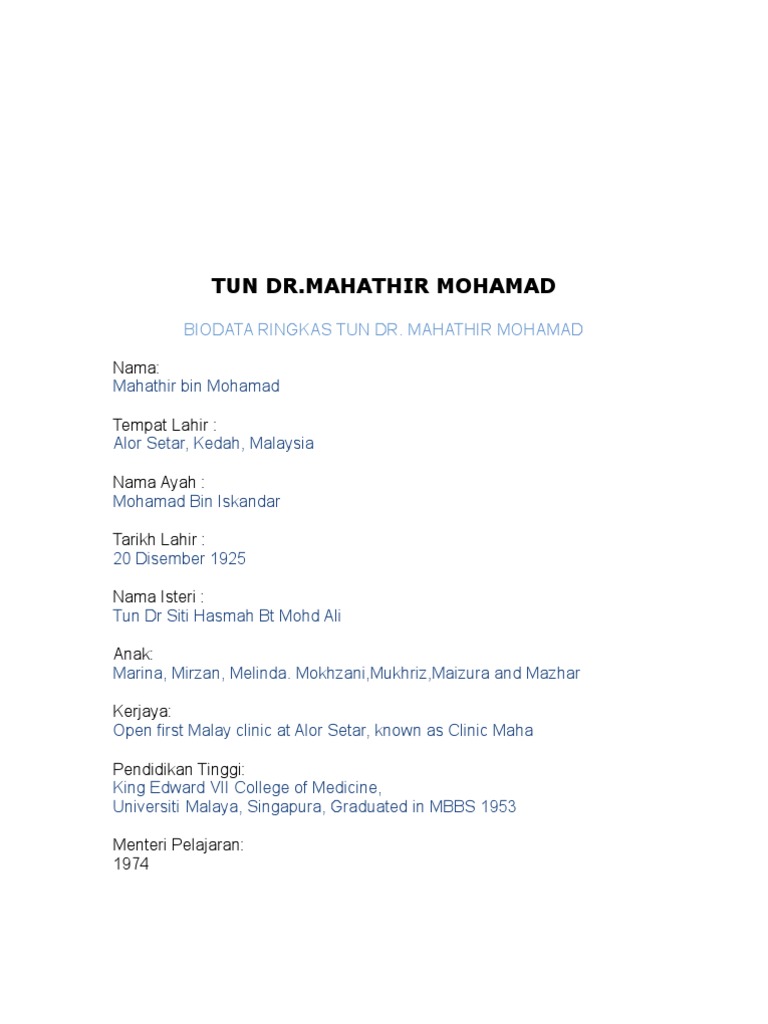 Pada 1947 ia mendapatkan masuk ke king edward vii college of medicine di singapura. Tun dr mahathir bin mohamad menjadi perdana menteri keempat malaysia pada tarikh 16 julai 1981. Dr mahathir dilahirkan pada 10 julai 1925 namun tarikh kelahiran rasminya direkodkan pada 20 disember 1925 di kampung seberang perak alor setar kedah. Tun dato sri dr mahathir bin mohamad dilahirkan pada 10 julai 1925.