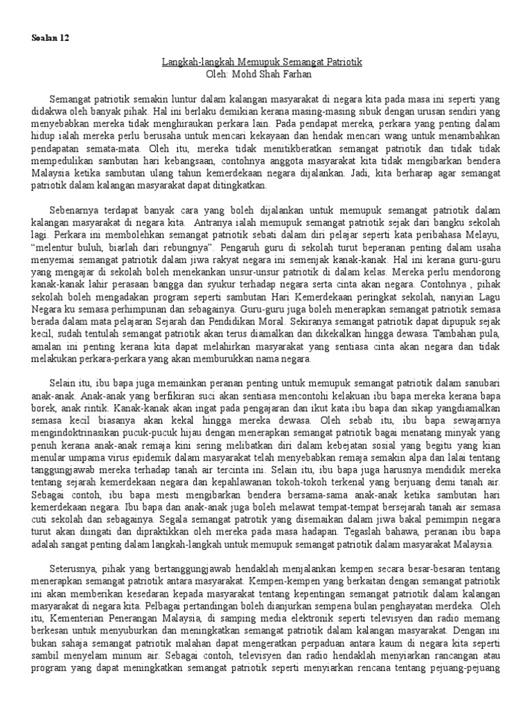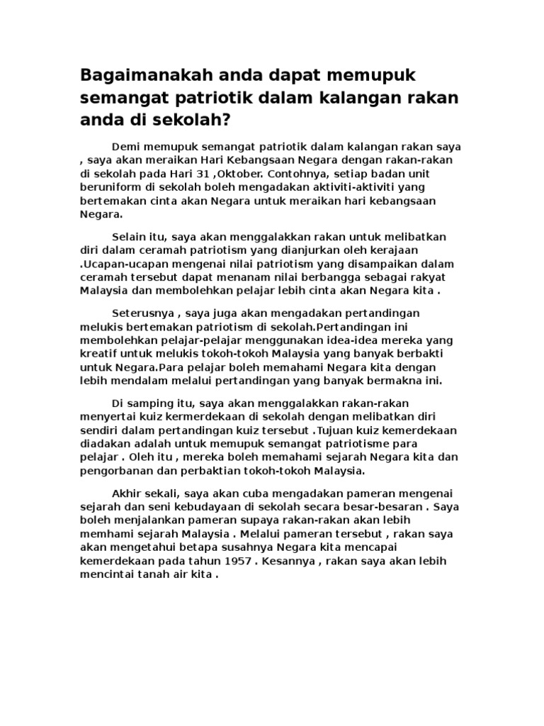 Hal ini amat jelas menunjukkan bahawa usaha ibu bapa dalam memilih buku buku yang sesuai untuk anak anak adalah amat penting. Sejak dahulu lagi pihak kerajaan masyarakat pihak sekolah dan ibu bapa telah menjalankan pelbagai langkah untuk memupuk semangat patriotisme dalam kalangan belia. Semoga semua individu di negara kita memiliki semangat patriotik yang tinggi dansentiasa berusaha untuk memajukan diri dan negaranya. Semangat cinta akan negara merupakan antara tajuk soalan yang popular untuk digunakan dalam soalan karangan bahasa melayu pelbagai isi dan idea bernas yang boleh diolah oleh pelajar supaya menghasilkan penulisan karangan yang baik.