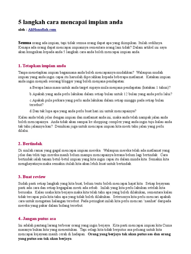Sekiranya terdapat topik yang tidak difahami saya akan bertanya kepada guru. Untuk mewujudkan impian banyak hal yang tidak bisa dilakukan untuk sementara waktu sebab anda perlu bekerja keras. Saya akan menumpukan sepenuh perhatian semasa guru sedang mengajar di kelas. Jangan takut untuk memulai dan carilah cara dalam mengatasi kegagalan anda pun harus sadar bahwa inilah usaha yang yang perlu dilakukan untuk menjadi maju.