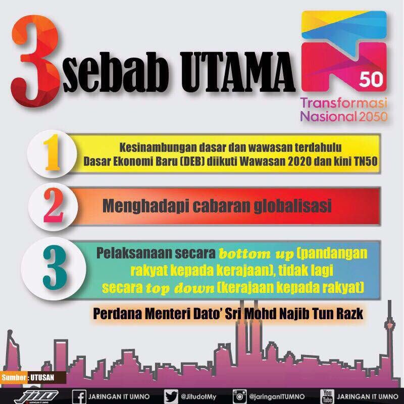 Transformasi nasional 2050 tn50 yang diperkenalkan olen perdana menteri malaysia datuk seri najib merupakan suatu dasar yang disifatkan pengganti kepada wawasan 2020 yang diperkenalkan oleh tun mahathir yang dikatakan bakal pembaharuan dimana suara rakyat dijadikan sebagai penentu kepada ketetapan visi dan misi malaysia dalam tempoh 30 tahun akan datang. Wawasan 2020 or vision 2020 is a malaysian ideal introduced by the fourth and seventh prime minister of malaysia mahathir mohamad during the tabling of the sixth malaysia plan in 1991. Fikrah seorang negarawan tulen bukan hanya berbicara soal pilihanraya akan datang tetapi yang lebih penting generasi masa hadapan atau dengan izin a state man not merely talk about next general election but instead next generation. 1991 2020 wawasan 2020.